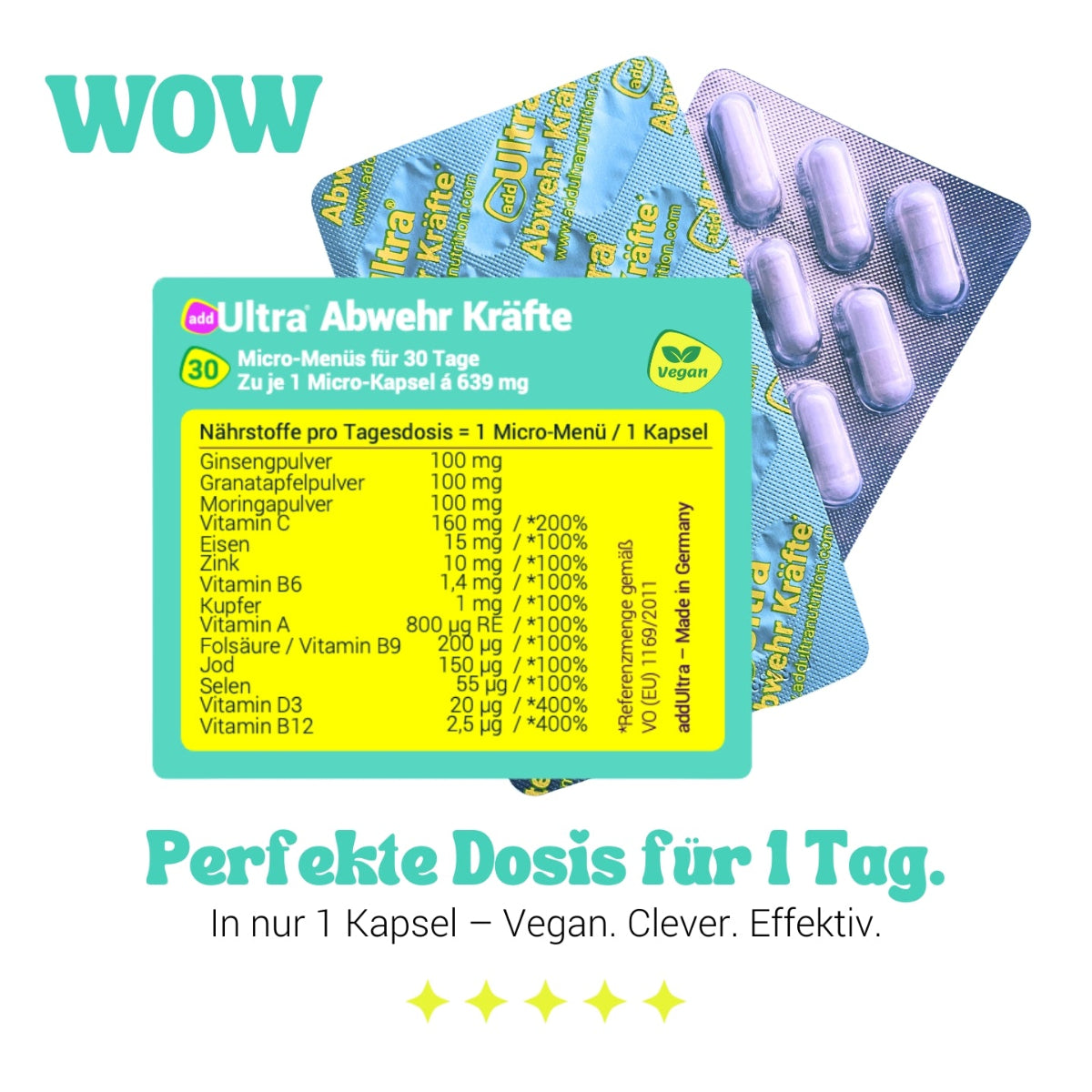 "addUltra Abwehr Kräfte sollte täglich eingenommen werden, um eine kontinuierliche Versorgung der Zellen deines Immunsystems sicherzustellen und eine optimale Wirkung zu erzielen. Am besten zu einer Mahlzeit, denn viele der enthaltenen Vitamine und Mineralstoffe, insbesondere fettlösliche wie Vitamin D3, werden am besten zusammen mit etwas Nahrung aufgenommen. Besonders sinnvoll ist die Einnahme morgens zum Frühstück oder zum Mittagessen, da stoffwechselanregende Inhaltsstoffe wie Ginseng aktivierend wirken können. So profitierst du tagsüber von der Energie und Konzentrationssteigerung. Zudem können die B-Vitamine und das Vitamin C das Energielevel unterstützen. 🥗🫕🍽️"