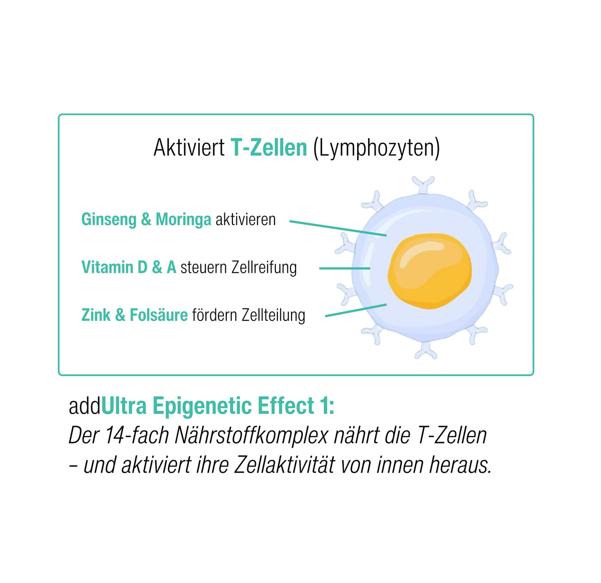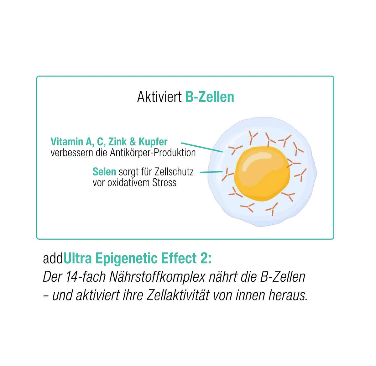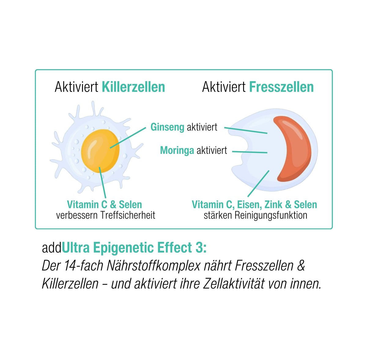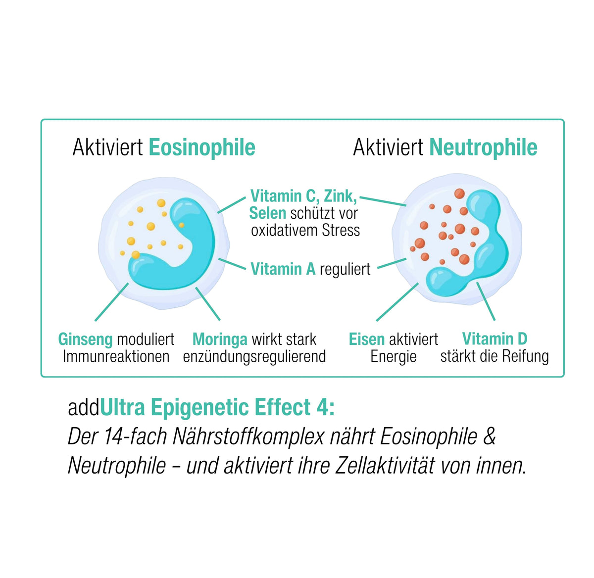 Wirkungsnachweise der Europäischen Behörde für Lebensmittelsicherheit (EFSA) auf der addUltra Abwehr Kräfte Verpackung:(1) Vitamin D, Kupfer, Eisen, Zink und Selen tragen zu einer normalen Funktion des Immunsystems bei. (2) Vitamin C trägt zu einer normalen Funktion des Immunsystems bei.