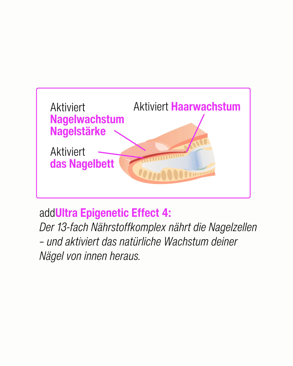 Treibt die Bildung von Keratin voran. Das fördert das Haarwachstum und starke Nägel.